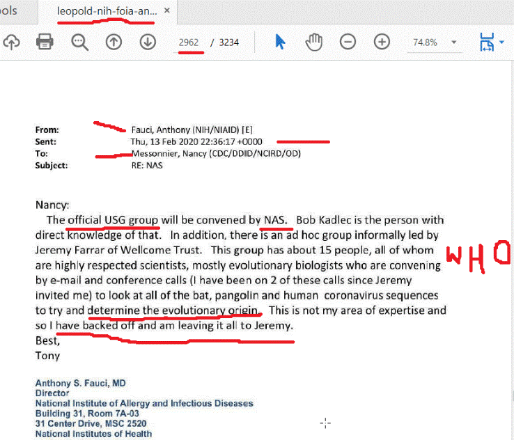 WHO scientists given free rein in U.S. government laboratories, access to Top Secret U.S. virus sequences information, via the Collaborating Center agreements with Federal institutions. And Fauci refusal to take charge of investigating Covid-19 origin, from the very beginning, but delegate that responsibility to the WHO.