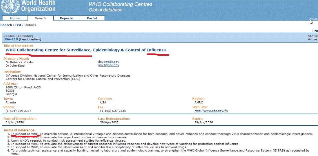The WHO has an office in the Atlanta CDC to collaborate on influenza viruses. Conflict of interest because their scientists are paid for by the World Economic Forum philantropists, and use different laboratory standards in creating therapies, than U.S. WHO's incentive is bad.