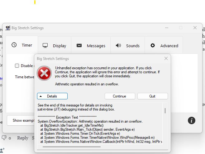 Otherwise, Big Stretch Reminder (v2.9.1) has been working well for me. I was happy/relieved to find a simple reminder program that is reasonably small and lightweight, as several programs I looked at were >100 MB, and one was well over 400 MB—I have a hard time trusting a reminder program that’s almost as big as Microsoft Office. I’ve been using the Windows Task Scheduler as a makeshift reminder program, having it launch a “Take a break …” .txt file via Notepad every 30 minutes, but I decided to try something a bit more sophisticated … Big Stretch Reminder as it turns out. So far, so good. Thanks.