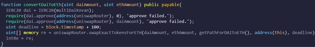 uniswapRouter.swapExactETHForTokens{ value: msg.value }(0, getPathForETHtoDAI(), address(this), deadline);