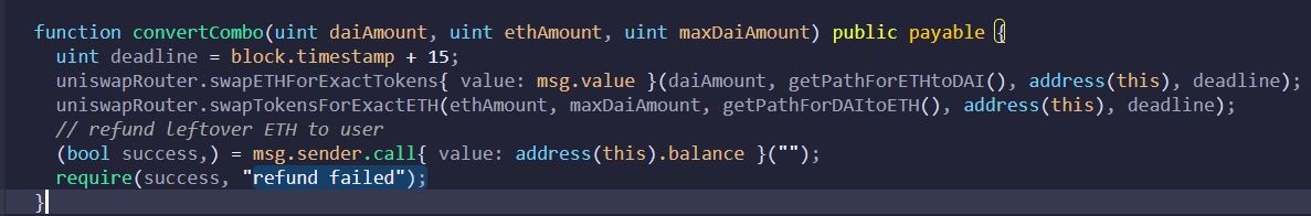 uniswapRouter.swapETHForExactTokens{ value: ethAmount }(daiAmountToBuy, getPathForETHtoDAI(), address(this), deadline);